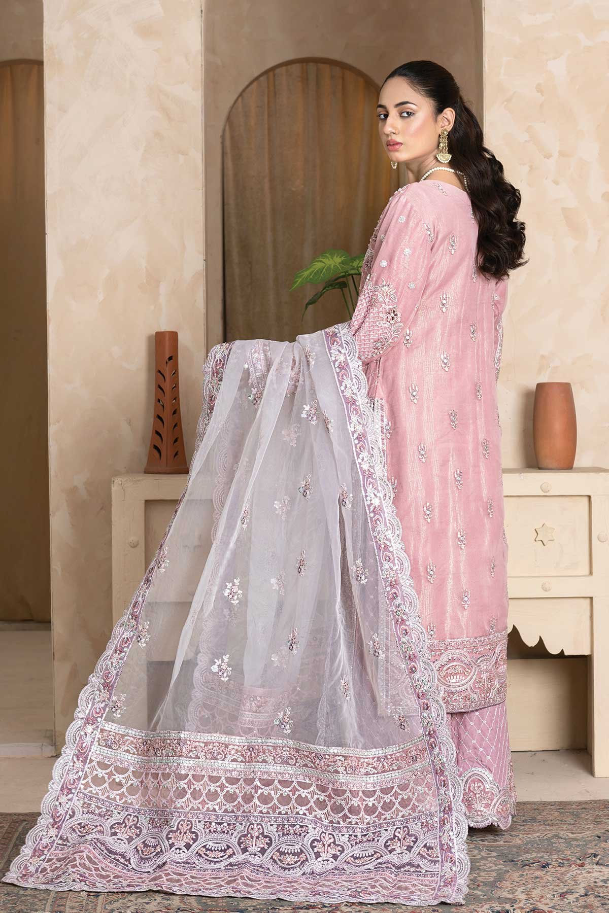 An elegant formal ensemble crafted in a soft blush-pink hue, this outfit showcases intricate embroidery with delicate floral and pearl-inspired embellishments. The shirt is adorned with fine threadwork, sequins, and bead detailing, creating a refined, luxurious aesthetic. Paired with a gracefully embroidered chiffon dupatta featuring scalloped borders, the look is completed with straight-cut PLAZO for a balanced silhouette. Ideal for festive occasions, formal gatherings, and intimate celebrations, this design blends timeless sophistication with contemporary grace.