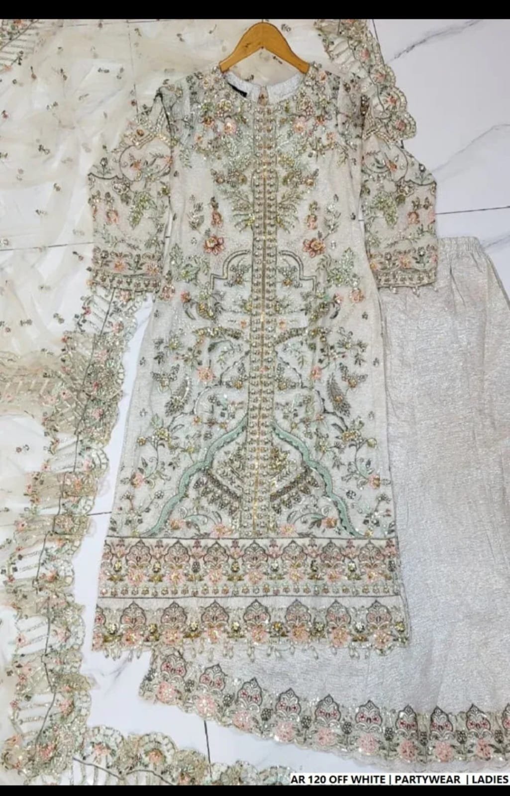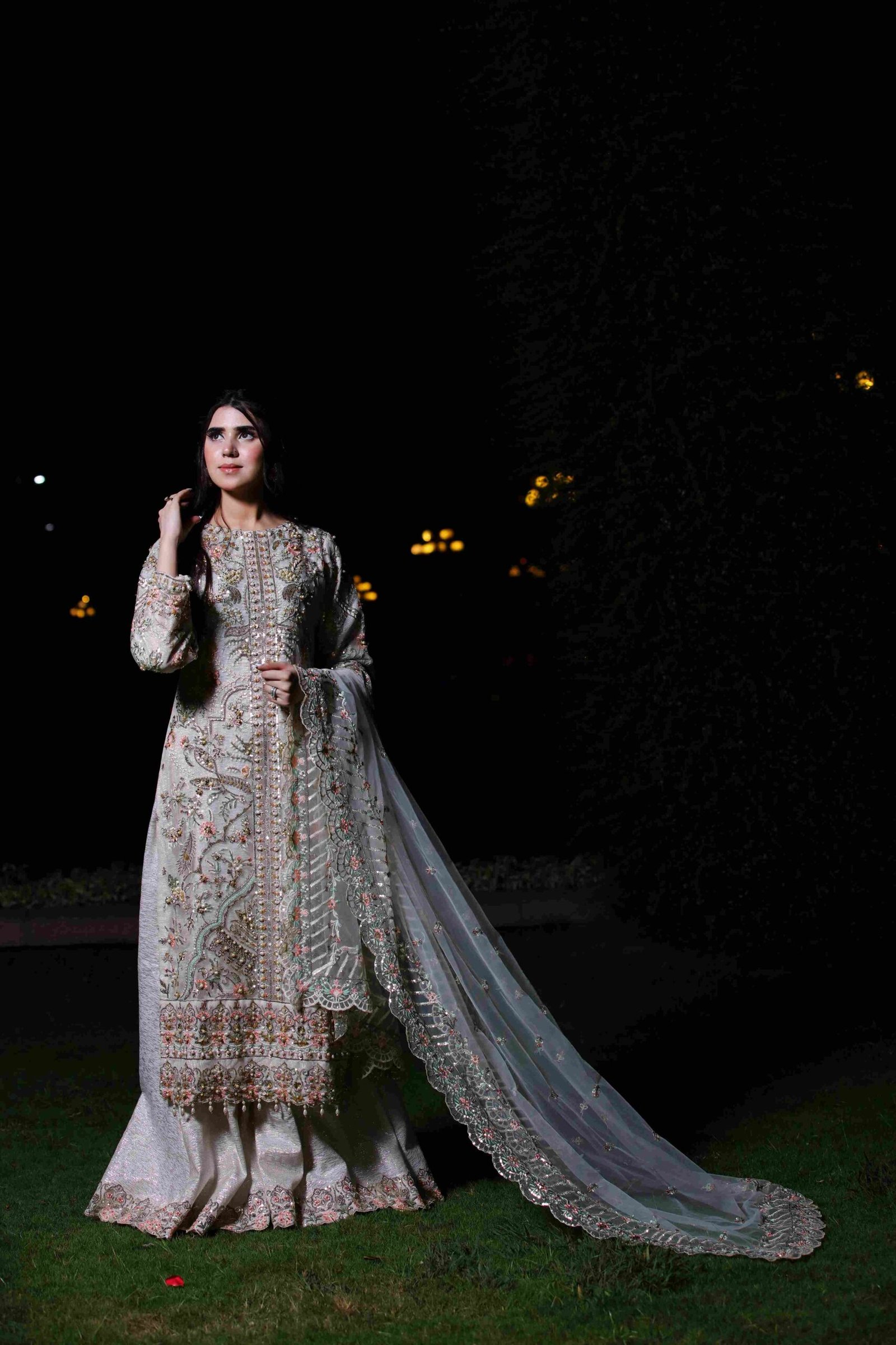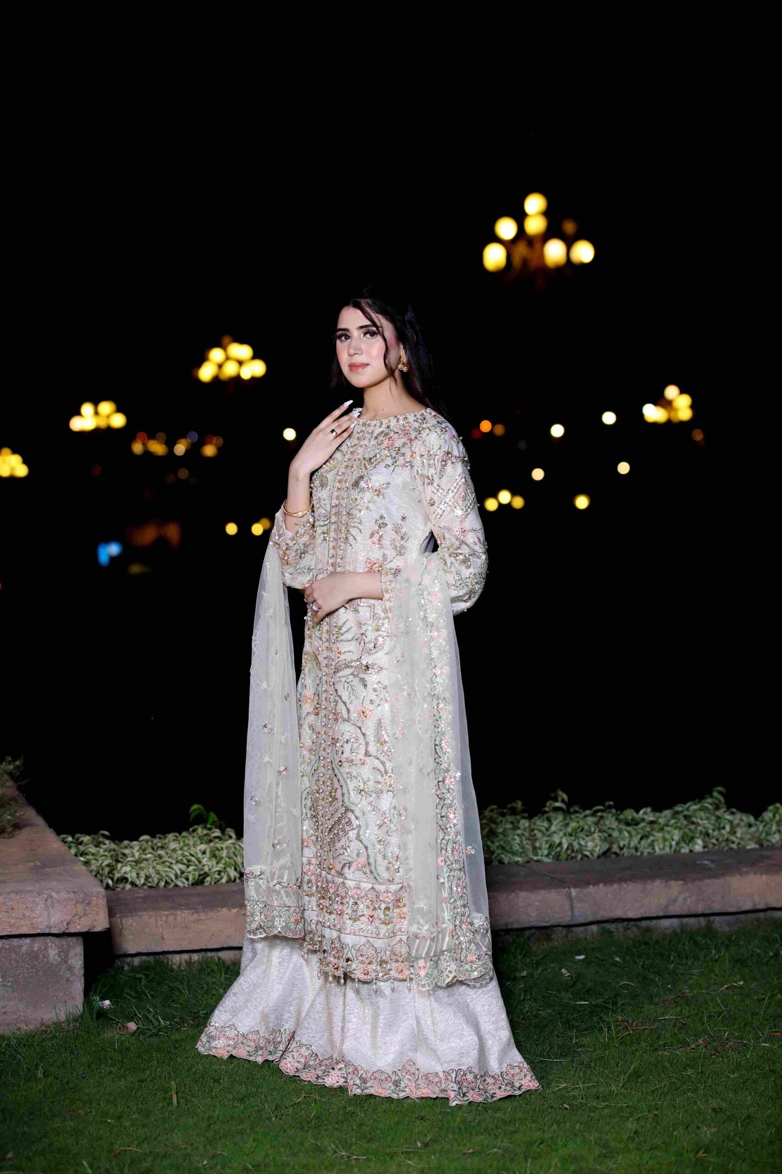 Additional Description: 1-Get ready to dazzle in this stunning ensemble! This net sequin embroidered shirt is beautifully enhanced with handcrafted work and pearl embellishments, complete with a shimmer attached lining 2-The matching net sequin embroidered dupatta adds an extra touch of elegance 3- Shimmer sequin embroidered shararah completes the look. You’ll be sure to turn heads in this exquisite outfit!