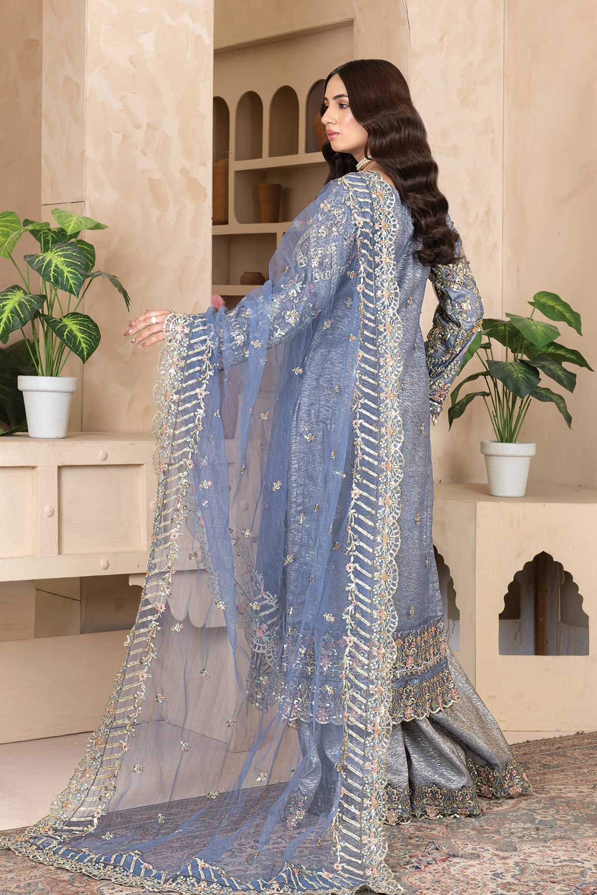 An elegant formal ensemble crafted in a soft blush-pink hue, this outfit showcases intricate embroidery with delicate floral and pearl-inspired embellishments. The shirt is adorned with fine threadwork, sequins, and bead detailing, creating a refined, luxurious aesthetic. Paired with a gracefully embroidered chiffon dupatta featuring scalloped borders, the look is completed with straight-cut trousers for a balanced silhouette. Ideal for festive occasions, formal gatherings, and intimate celebrations, this design blends timeless sophistication with contemporary grace.