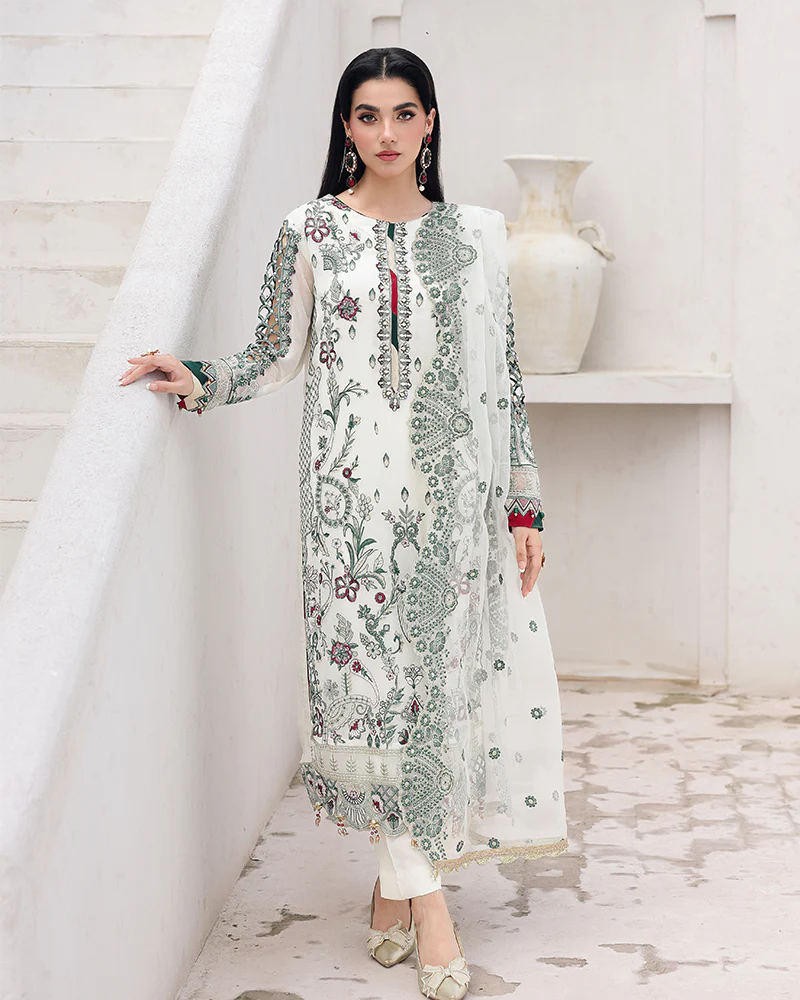 Chiffon shirt, beautifully adorned with sequin embroidery, pearls, crystals, and intricate cutdana details, all enhanced with eye-catching 3D embellishments.