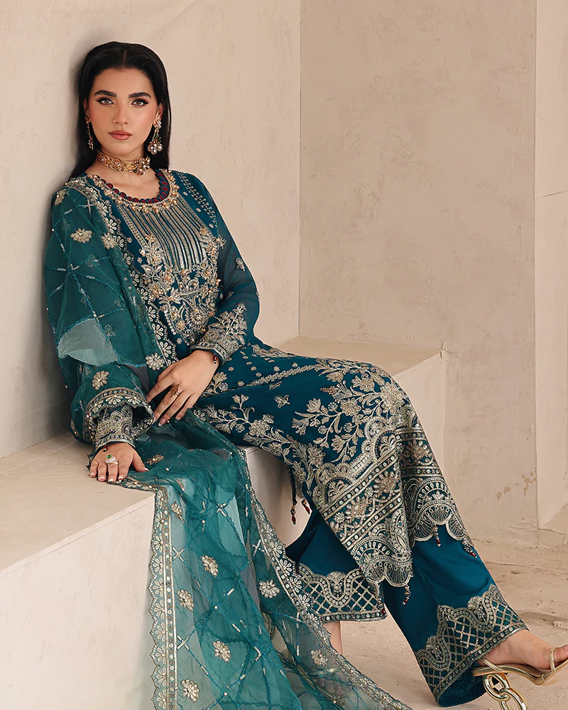 Chiffon shirt adorned with shimmering sequin embroidery, accented by pearls, crystals, naqshi work, and delicate hanging tassels