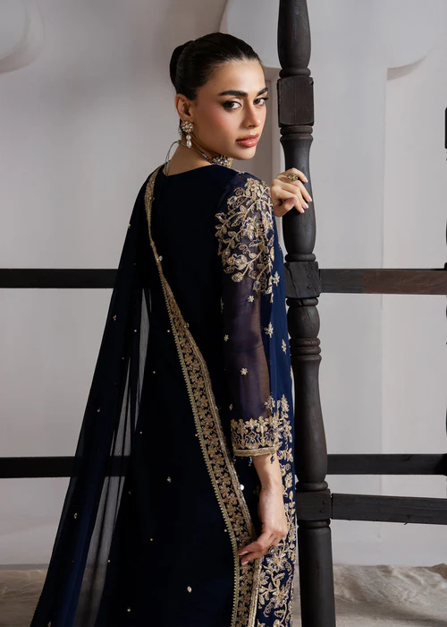 “1-Chiffon shirt featuring intricate dori sequin embroidery work, adorned with crystals diamnates and 3D embellishments. 2-chiffon dupatta crafted with exquisite dori embroidery pearls and lace 3-Elegant chiffon panel shararah composed with sequin embroidery and laces