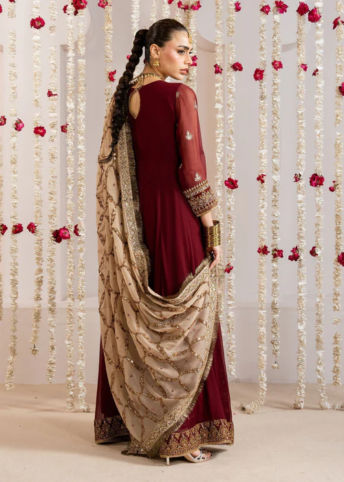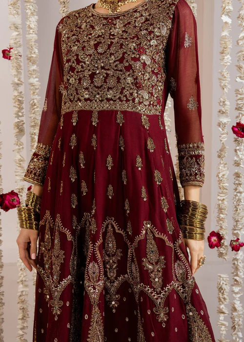 “1- stunning chiffon maxi featuring gorgeous spangle dori embroidery, crystal mirror work, and beautiful embellishments 2-chiffon dupatta adorned with sequin dori embroidery and delicate laces. 3-stylish raw silk trousers