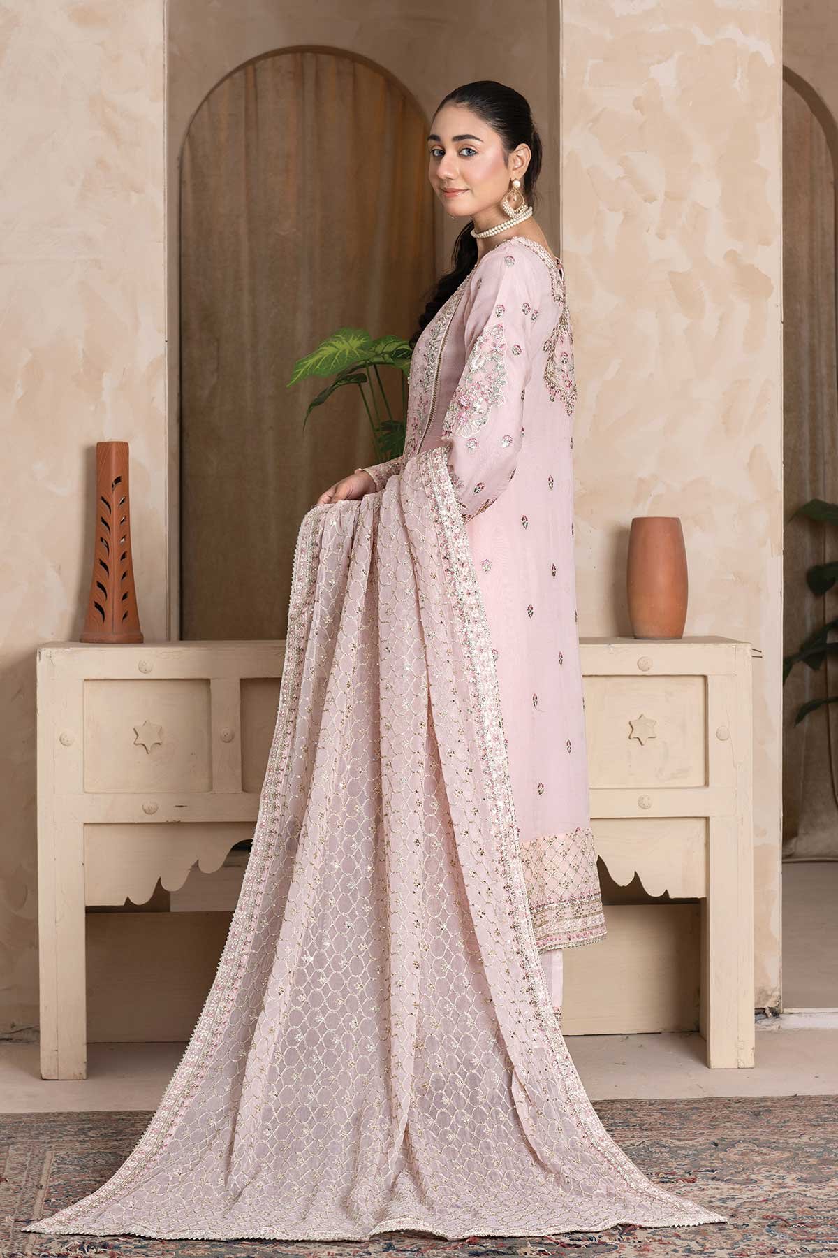 An elegant formal ensemble crafted in a soft blush-pink hue, this outfit showcases intricate embroidery with delicate floral and pearl-inspired embellishments. The shirt is adorned with fine threadwork, sequins, and bead detailing, creating a refined, luxurious aesthetic. Paired with a gracefully embroidered chiffon dupatta featuring scalloped borders, the look is completed with straight-cut trousers for a balanced silhouette. Ideal for festive occasions, formal gatherings, and intimate celebrations, this design blends timeless sophistication with contemporary grace.