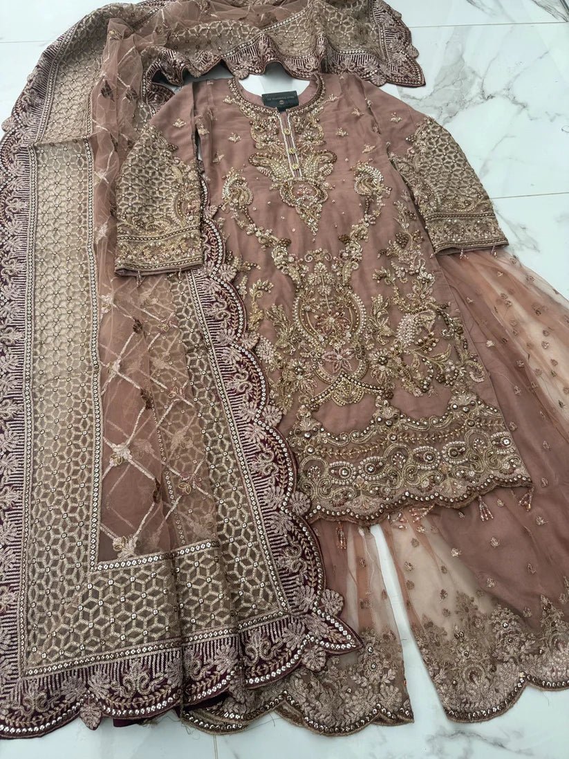 This beautiful 3-piece imrozia suit features a net shirt adorned with intricate all-over beadwork, creating a refined and graceful look along with detailed button embellishments along the middle. The net sharara is designed with delicate threadwork on the top, adding a touch of sophistication. Completing the ensemble is a net dupatta, finished with a heavy border and exquisite thread work for an elegant appeal.