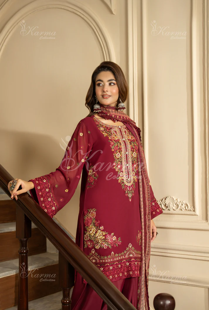 Georgette chiffon shirt with cross stitch embroidery and metal buttons on neck line