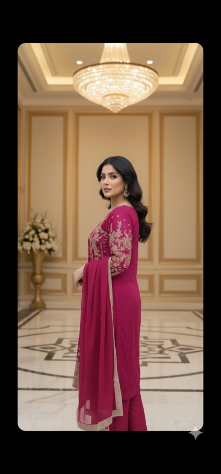 This elegant ensemble features a sophisticated straight shirt paired with a stylish Trouser, both crafted handwork embroidered  from luxurious shamoo silk fabric for a graceful and refined look. The shirt, with a flattering length of 40 to 42 inches, offers a chic and modern silhouette. Complementing the outfit, the delicate shifoon dupatta adds a touch of ethereal charm, enhancing its overall elegance.  this ensemble is perfect for those who appreciate a blend of contemporary style and timeless sophistication, making it an ideal choice for special occasions.