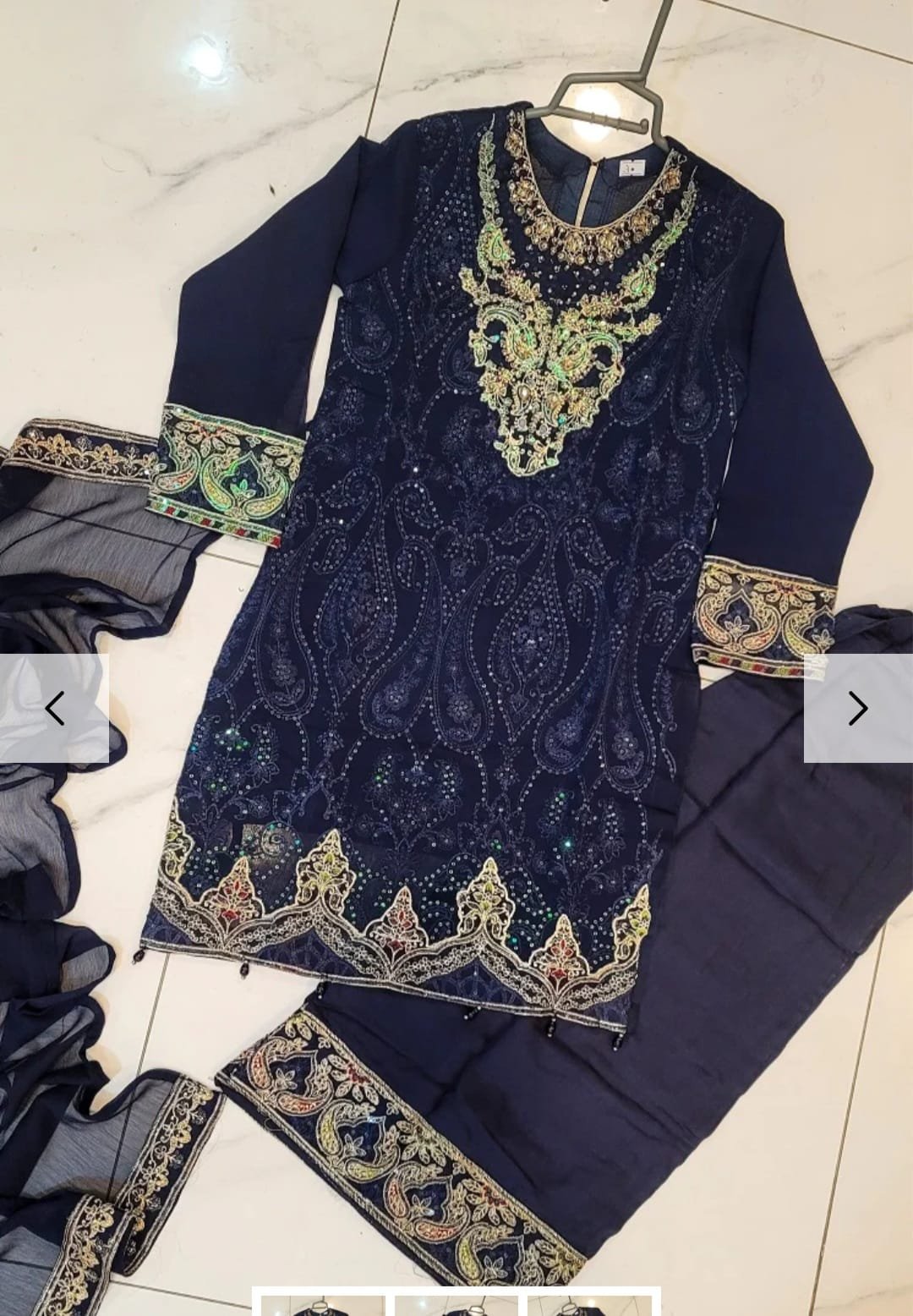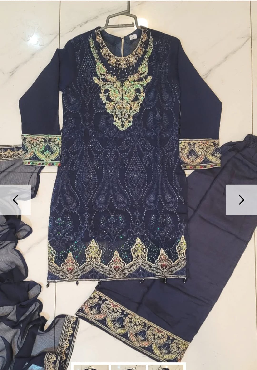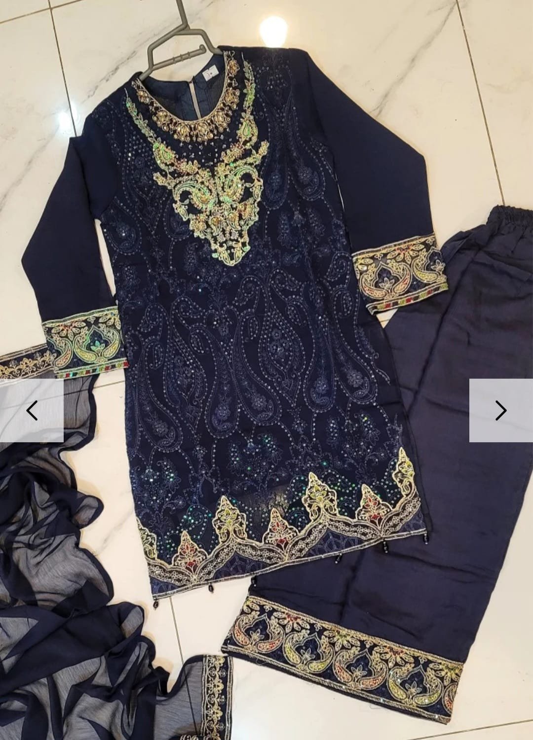 This elegant ensemble features a chiffon shirt paired with a comfortable grip trouser and a matching chiffon dupatta. The design showcases a stylish straight shirt with palazzo pants, perfect for both casual and formal occasions. The shirt length ranges between 43 to 45 inches, offering a graceful silhouette. Weighing just 0.750 kg, this outfit is lightweight and easy to carry, making it ideal for long wear and festive events.