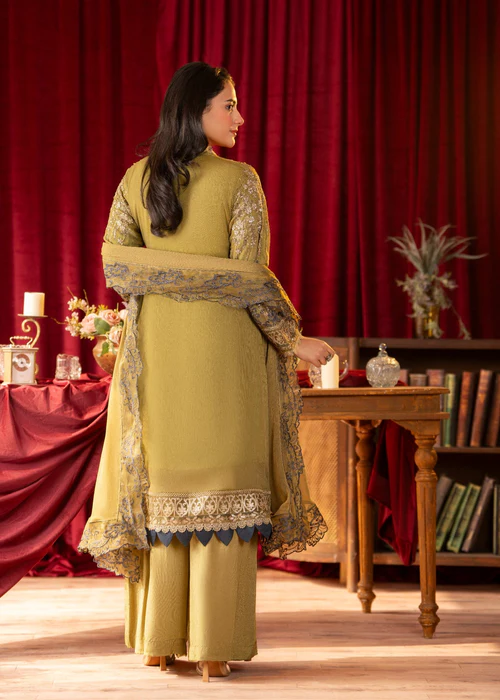 It sounds like you’re describing a beautiful and elegant embroidered chiffon outfit, likely consisting of a three-piece set. Chiffon is a lightweight, airy fabric, known for its delicate texture and graceful drape. It’s often used for dresses, shawls, and tops, adding a soft and ethereal quality to the overall design. Embroidered with intricate patterns, often around the neckline or throughout the garment. The neck embellishments could include delicate thread work, beads, or sequins, adding a bit of sparkle or richness. A pair of sophisticated dupatta is made for organza with fully embroidered and beautiful trouser is made for raw silk.