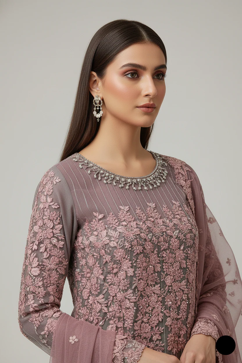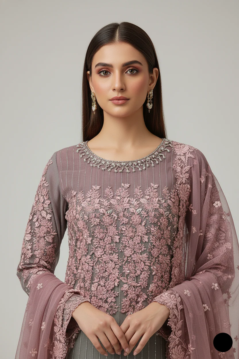 This stylish 3-piece outfit features a straight-cut chiffon shirt paired with comfortable grip trousers and a matching chiffon dupatta. The shirt comes with a graceful length of 40 to 42 inches, making it perfect for both casual gatherings and semi-formal occasions. With a total weight of just 1.00 kg, this ensemble is light, breathable, and ideal for long wear without compromising on elegance.