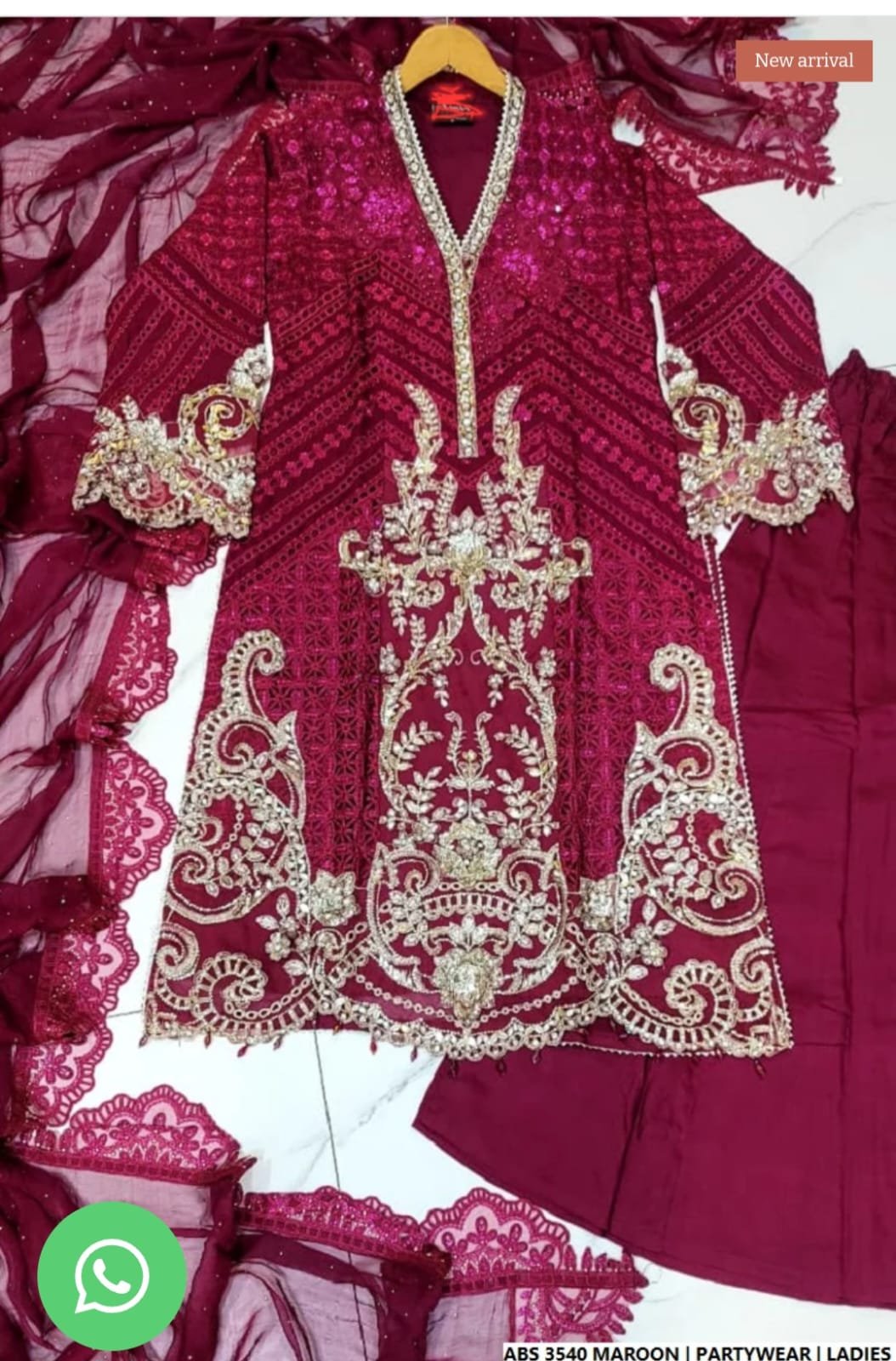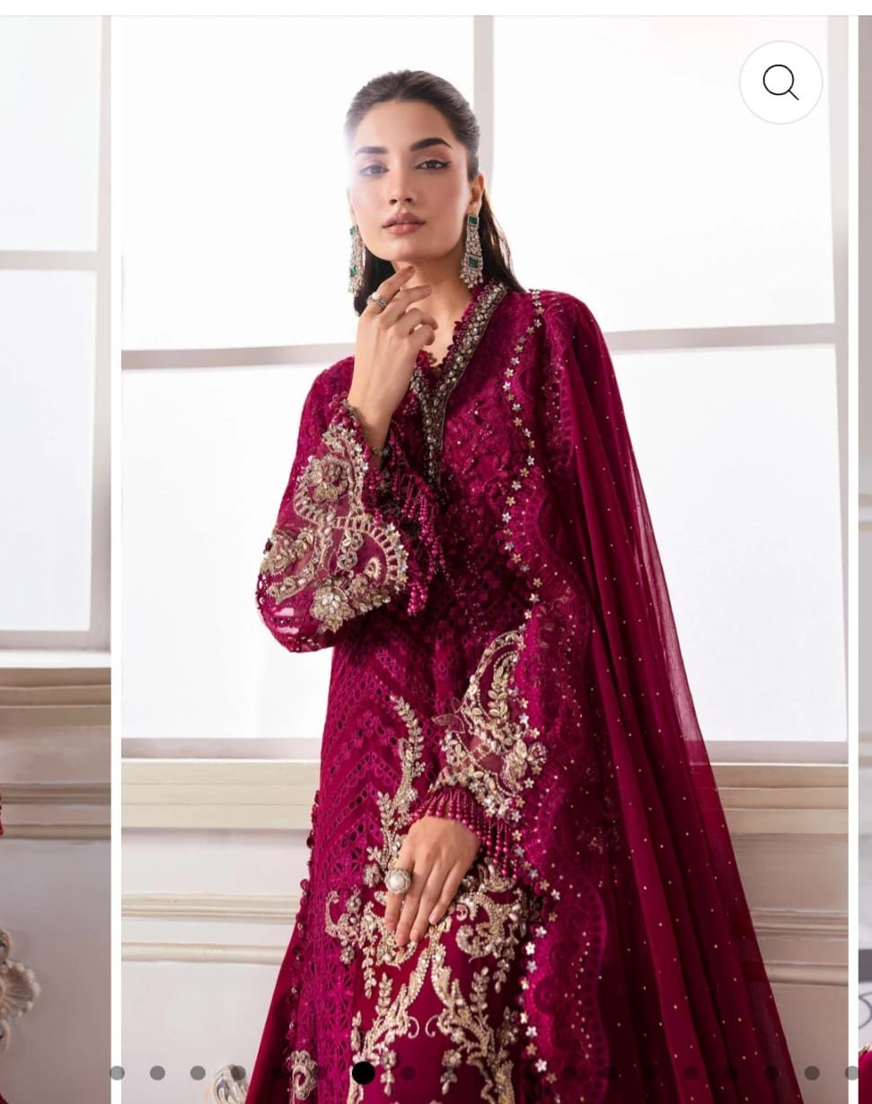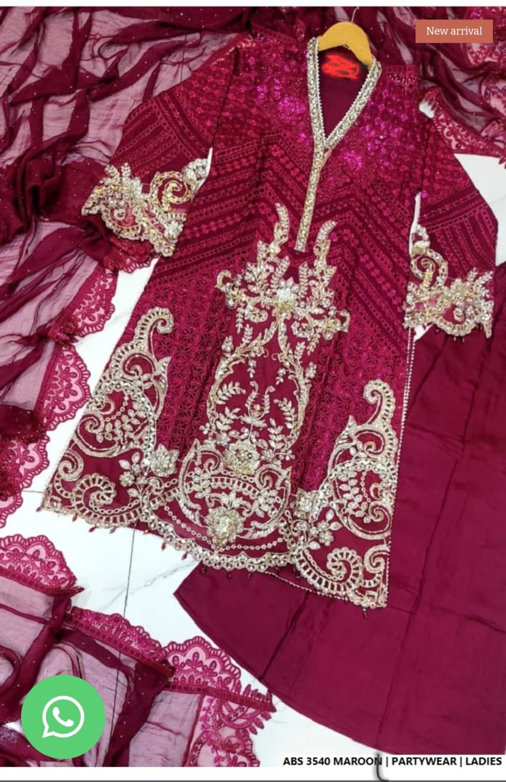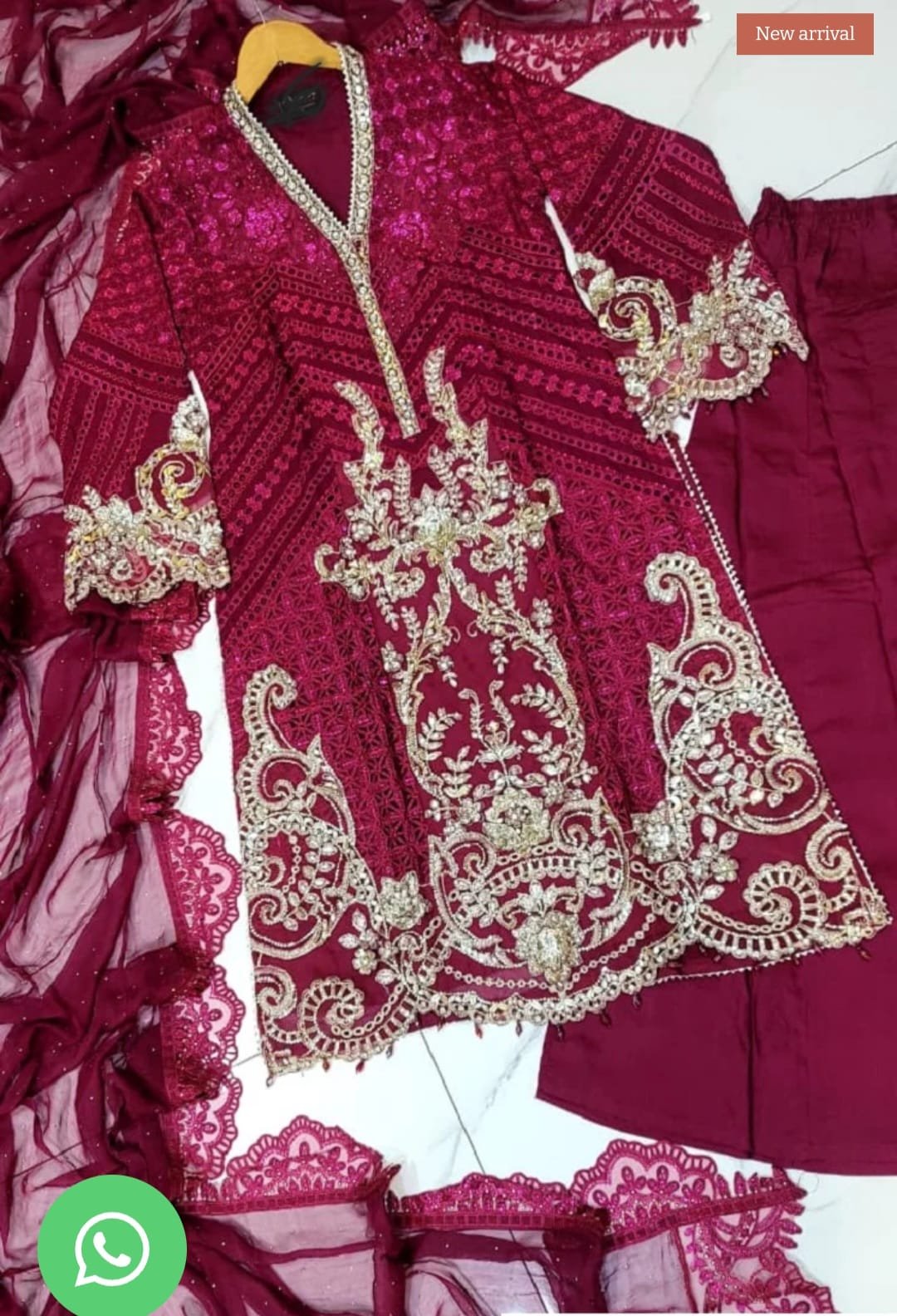 This three‑piece suit combines a flowing chiffon A‑line shirt, soft viscose plazo trousers, and a matching chiffon dupatta to create an ensemble that drapes beautifully. Chiffon is prized for its lightweight, breathable and sheer texture, which adds grace and movement to the shirt and dupatta, while viscose brings a silk-like softness and excellent drape to the trousers — an ideal pairing for both comfort and visual elegance. At approximately 1.200 kg, this suit strikes a balance between delicate silhouette and luxurious feel—slightly heavier than standard 3‑piece chiffon sets (which often weigh around 850 g)—providing a bit more substance without compromising on airiness. The A‑line top flares elegantly into a graceful palazzo hemline, making it perfect for formal occasions, weddings, or festive gatherings where you prefer refined modern styling over fitted cuts.