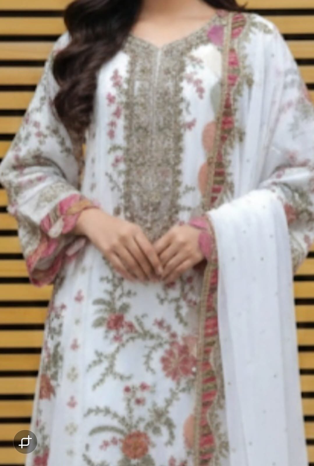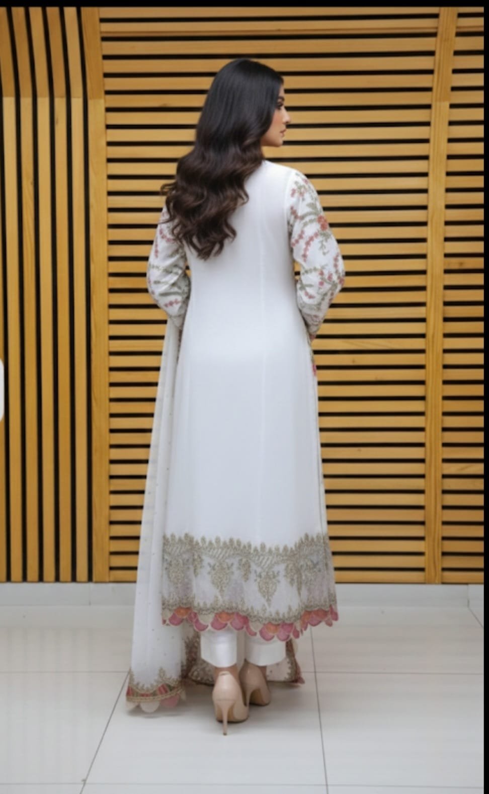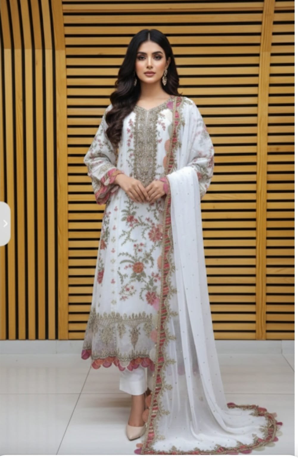 1. This graceful long frock is crafted from elegant chiffon fabric, paired with soft viscose trousers for a refined and comfortable fit. The matching chiffon dupatta adds an airy, sophisticated touch to the ensemble. With a shirt length of 52 to 54 inches, it provides a flattering and elongated silhouette, ideal for both casual and formal occasions. Weighing just 1.500 kg, this lightweight outfit combines style, comfort, and elegance in one perfect ensemble.