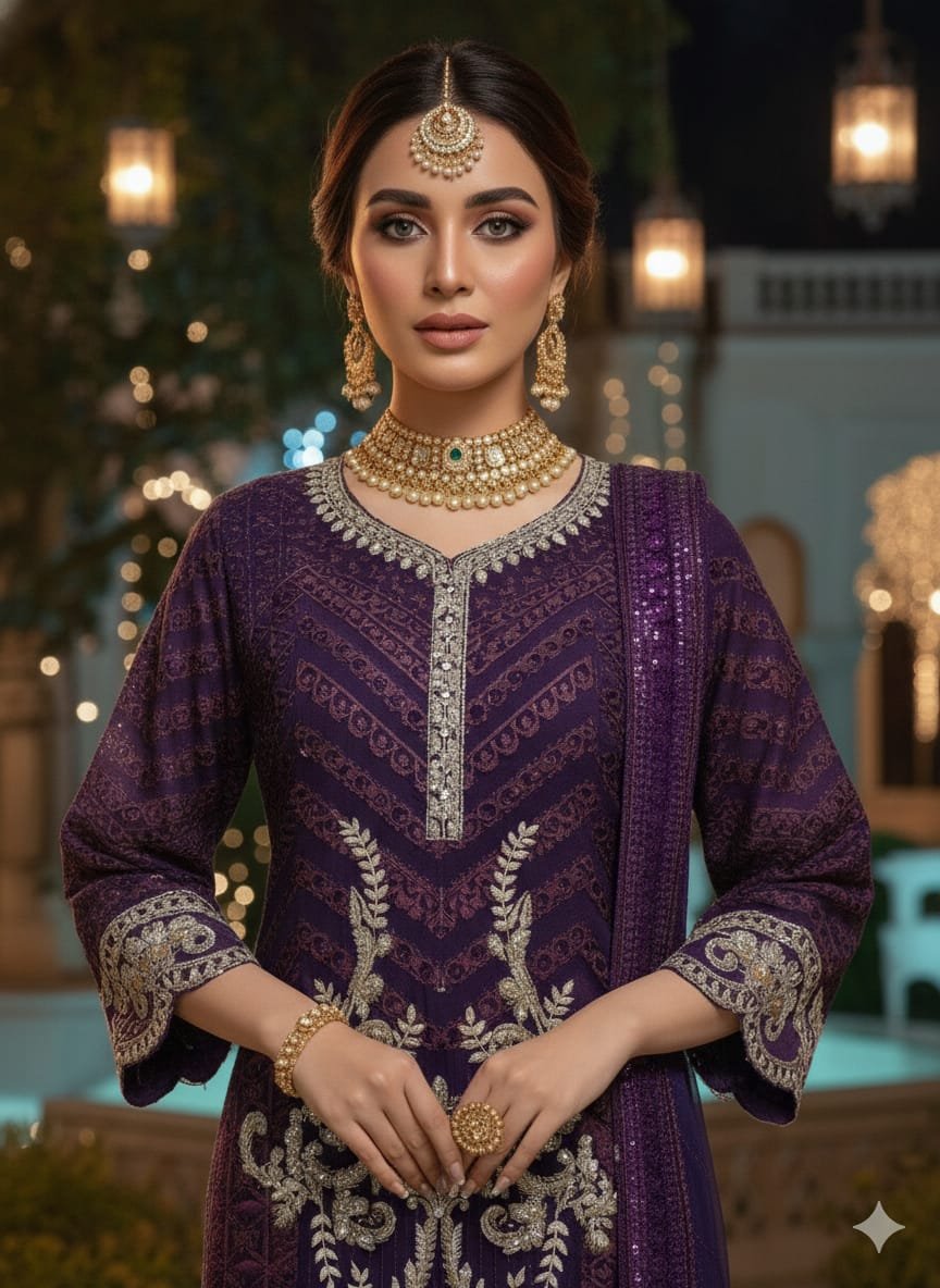 This three‑piece suit combines a flowing chiffon A‑line shirt, soft viscose plazo trousers, and a matching chiffon dupatta to create an ensemble that drapes beautifully. Chiffon is prized for its lightweight, breathable and sheer texture, which adds grace and movement to the shirt and dupatta, while viscose brings a silk-like softness and excellent drape to the trousers — an ideal pairing for both comfort and visual eleganceAt approximately 1.200 kg, this suit strikes a balance between delicate silhouette and luxurious feel—slightly heavier than standard 3‑piece chiffon sets (which often weigh around 850 g)—providing a bit more substance without compromising on airinessThe A‑line top flares elegantly into a graceful palazzo hemline, making it perfect for formal occasions, weddings, or festive gatherings where you prefer refined modern styling over fitted cuts.