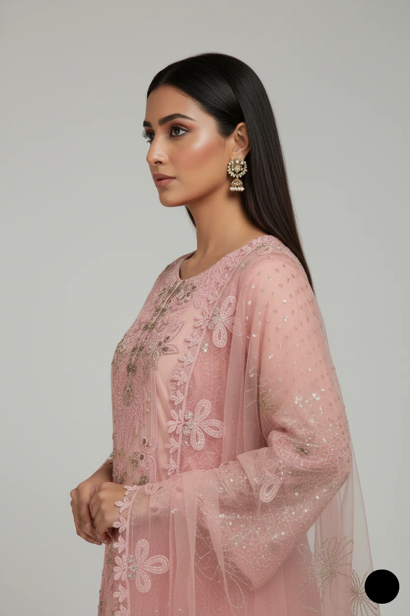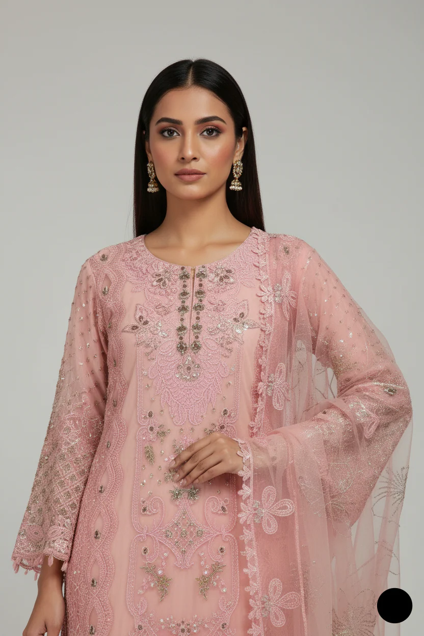 This sophisticated ensemble features a chiffon straight shirt paired with sleek grip trousers, offering a blend of elegance and modernity. The shirt, with a length ranging from 44 to 46 inches, provides a graceful and flattering fit. The trousers complement the flow of the outfit, while the delicate net dupatta adds an airy, refined finish. Weighing 1.200 kg, this outfit offers a perfect balance of style and structure, making it a standout choice for formal gatherings, festive occasions, or elegant evening wear.