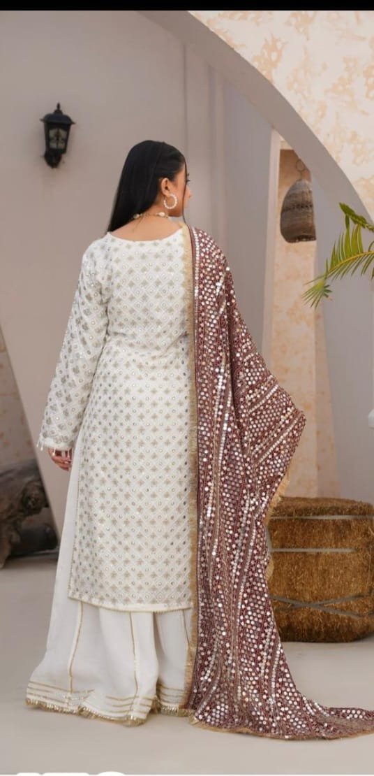 This graceful outfit features a straight-cut chiffon shirt paired with a stylish plazo trouser, delivering a perfect blend of elegance and comfort. The lightweight chiffon fabric adds a delicate and flowing appearance, while the grip trouser provides a relaxed yet polished look. A matching chiffon dupatta complements the set, making it ideal for semi-formal to festive occasions. With a flattering shirt length of 41/43 and a total outfit weight of 1.250 kg, it ensures effortless style without compromising comfort.