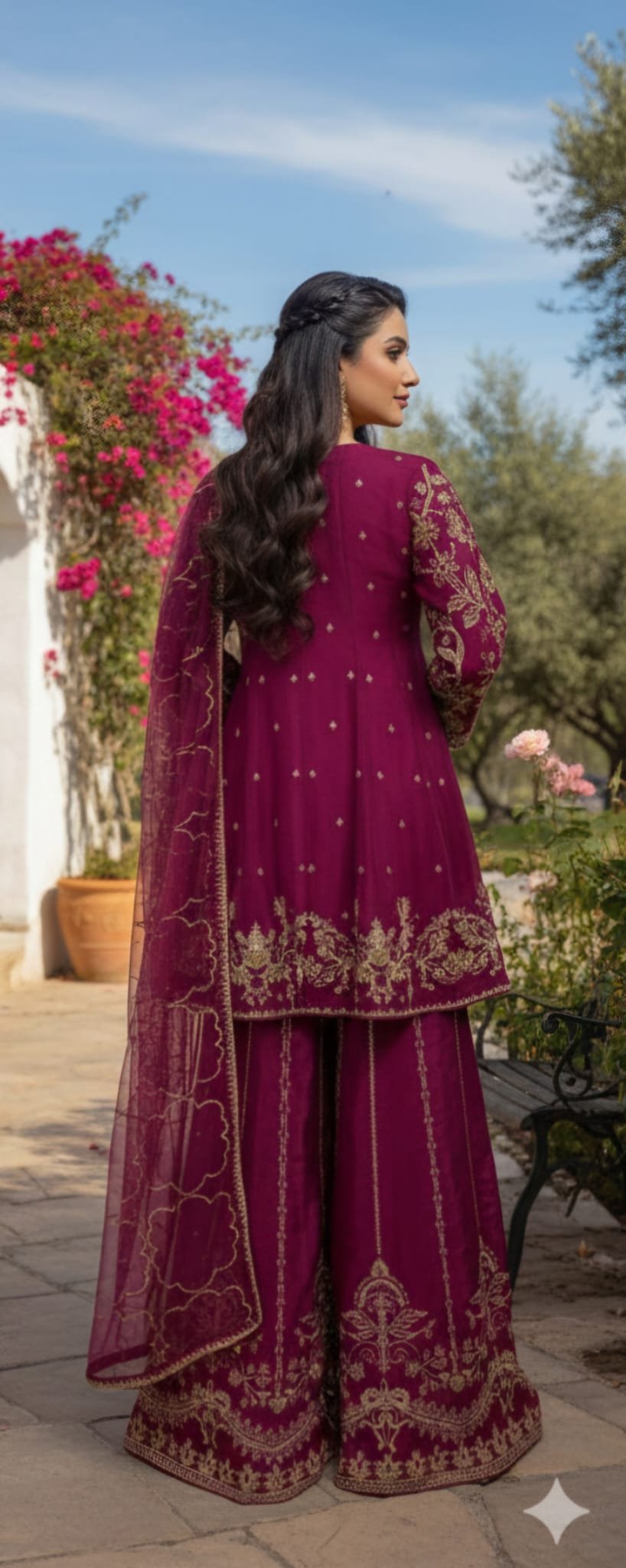 Elegant, handcrafted embroidered short frock in Paplan style, perfectly paired with an embroidered sharara and exquisite net embroidered dupatta.